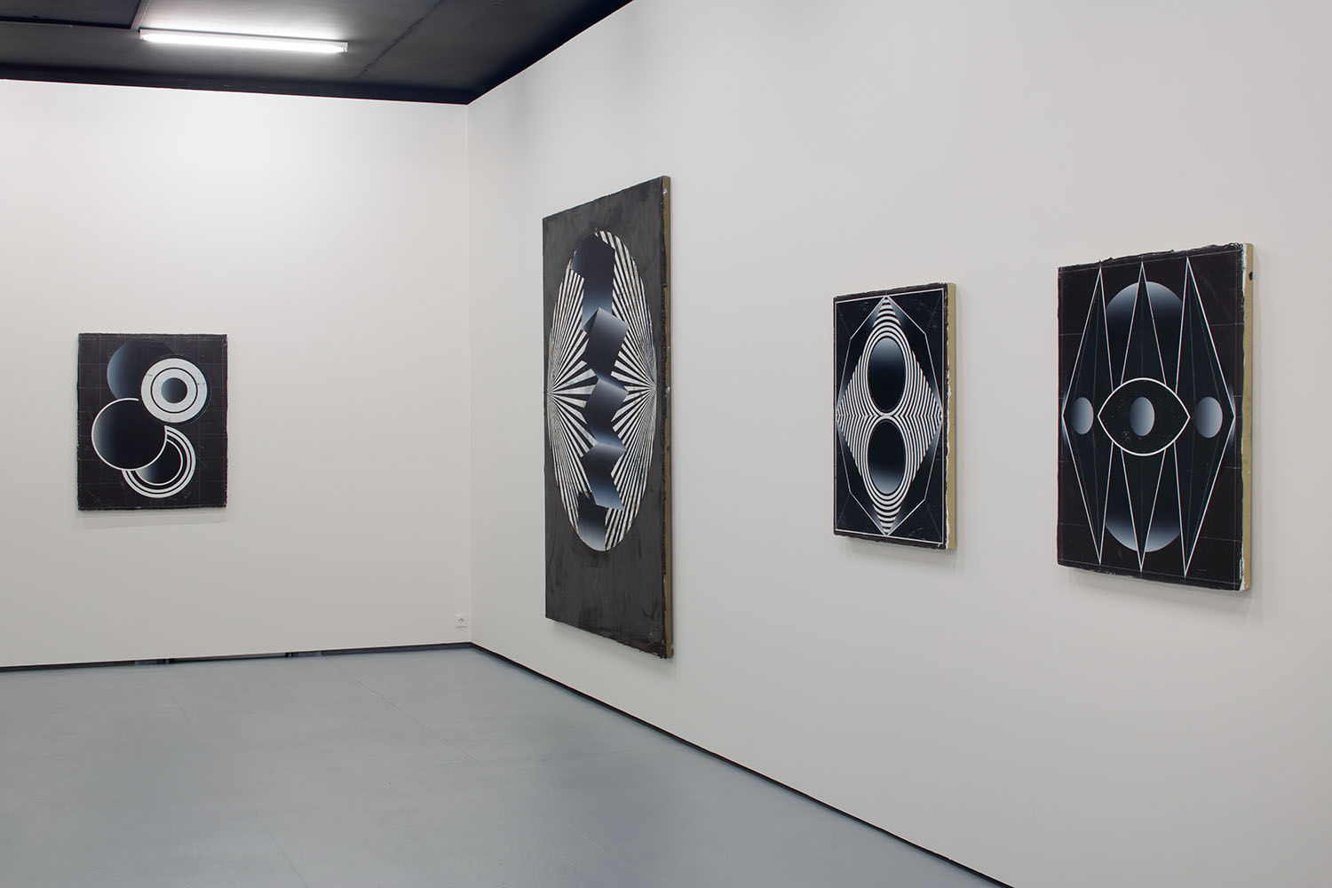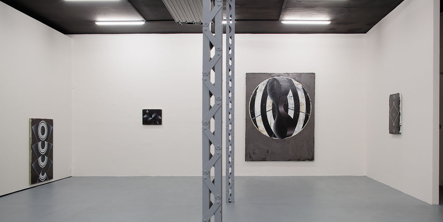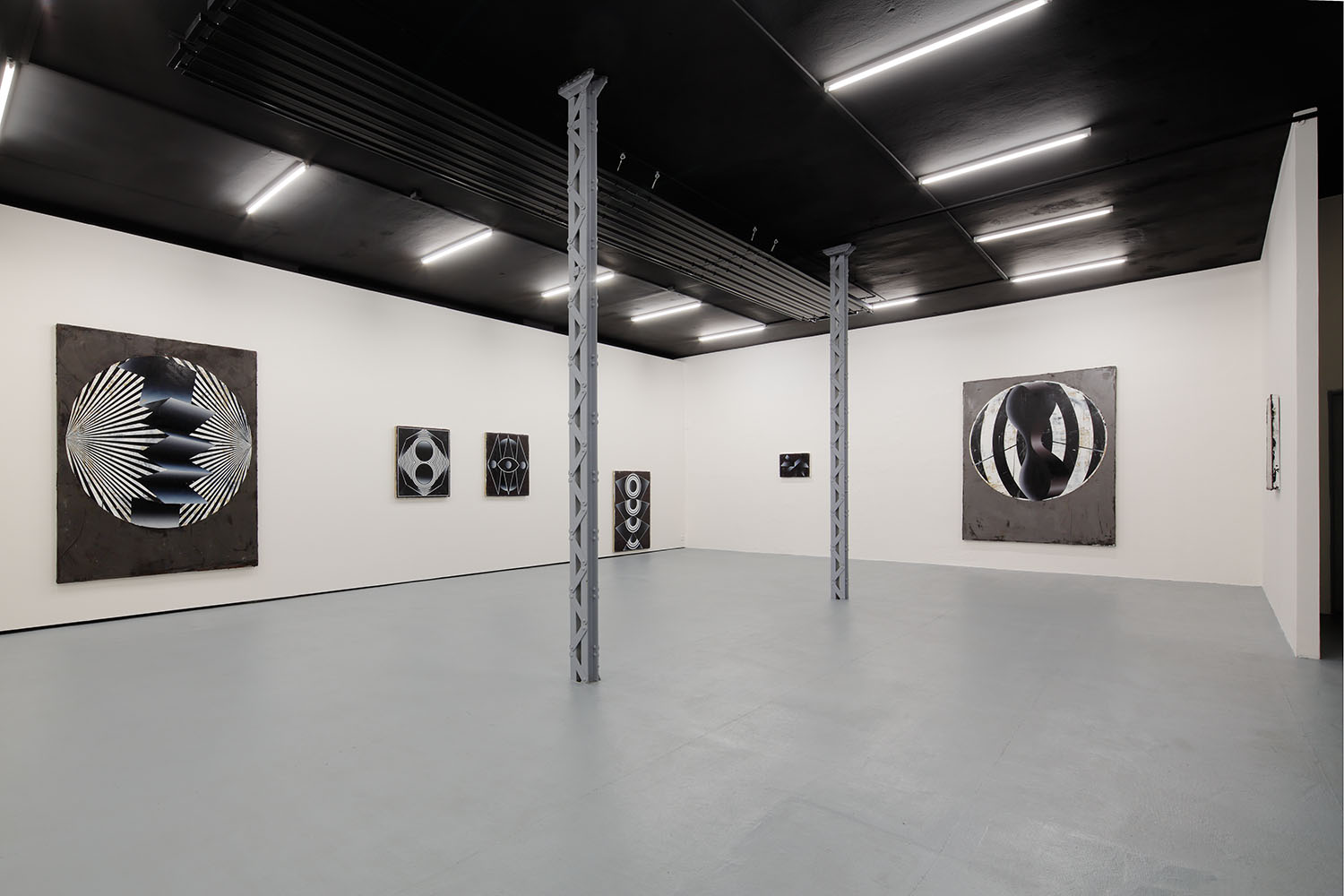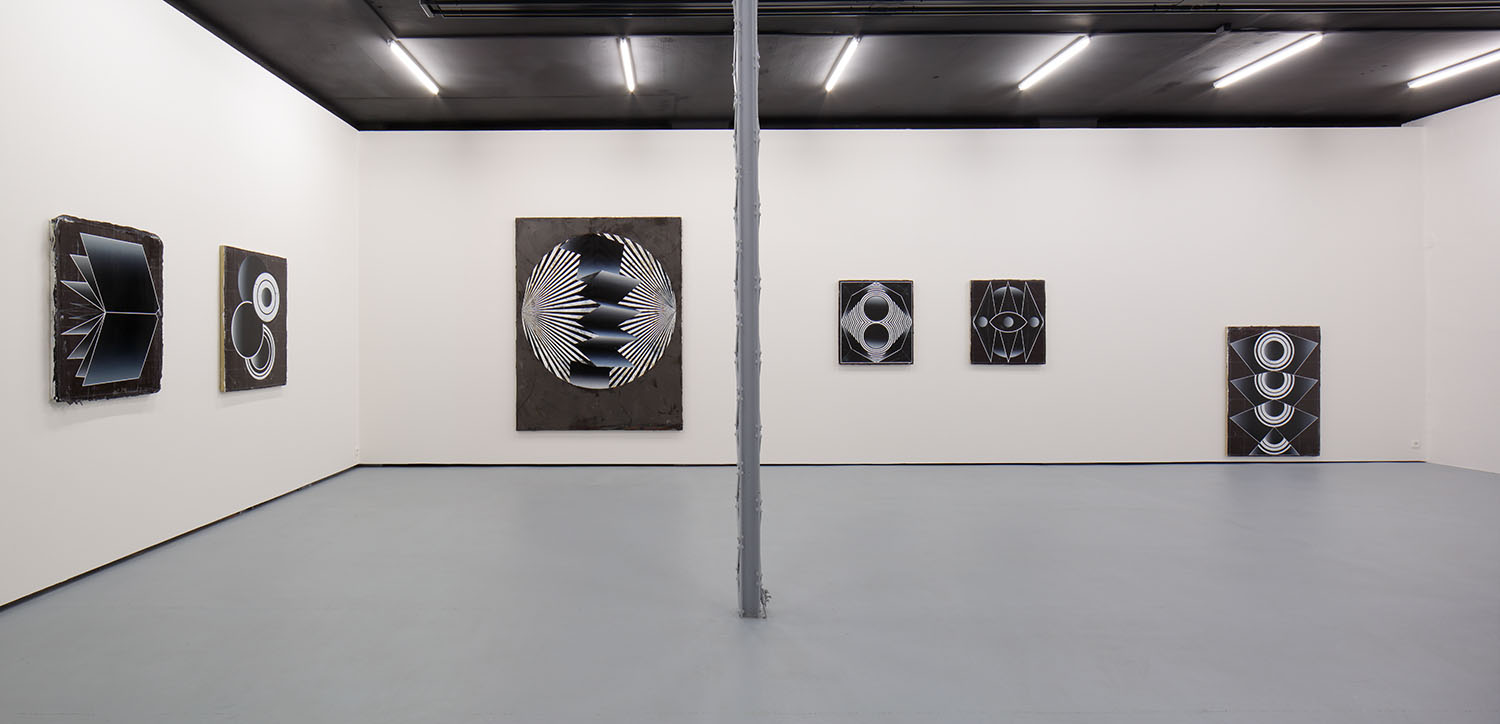 Symmetrical arrangements of concentric circles and polygons dominate the dark paintings in the Future Polis exhibition by Czech artist Vladimir Houdek.