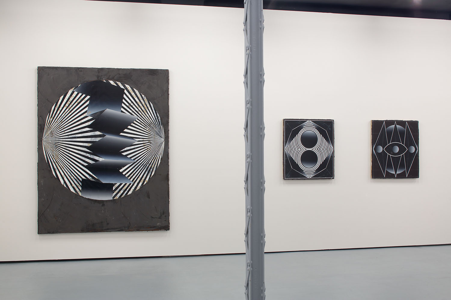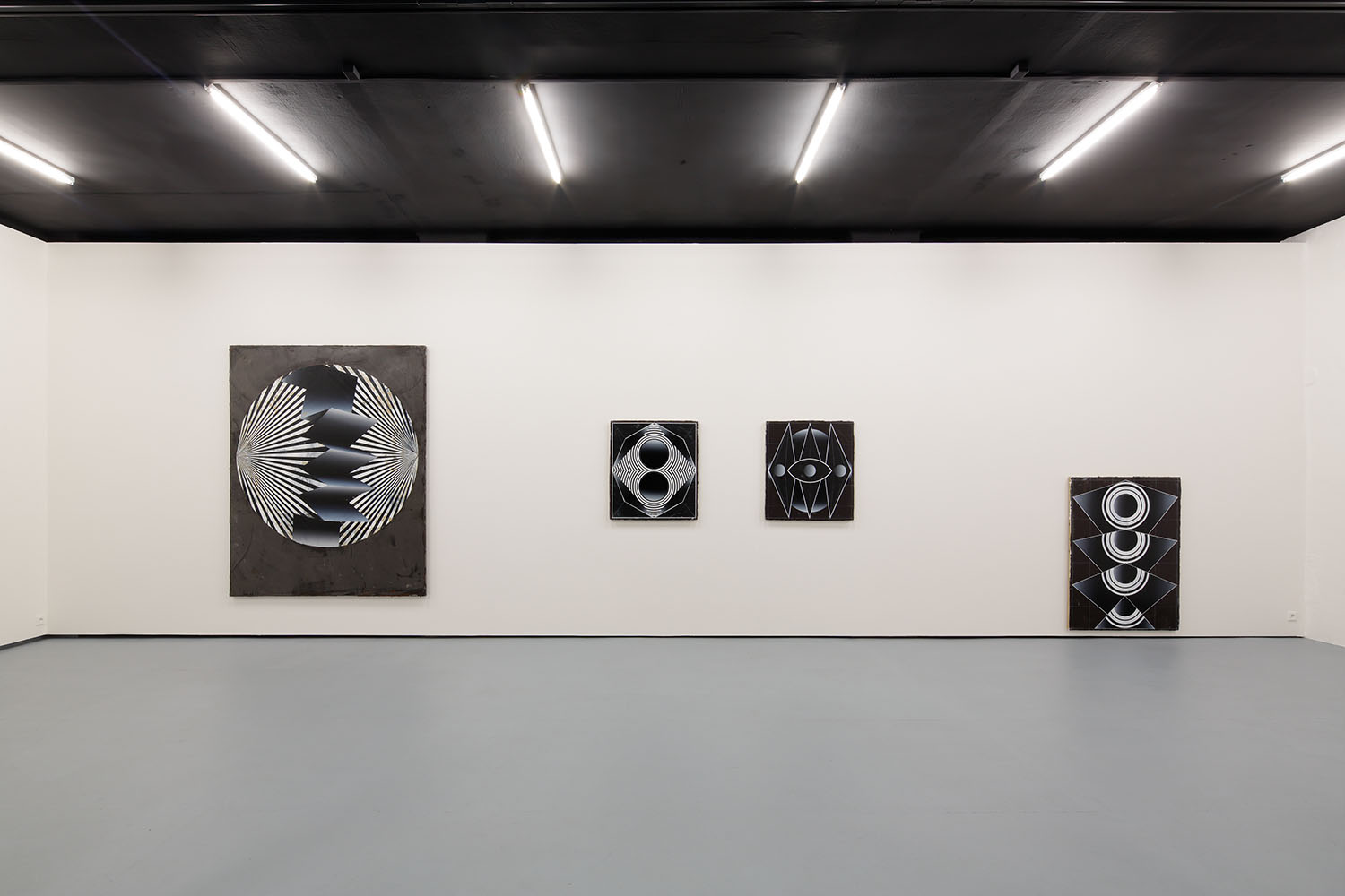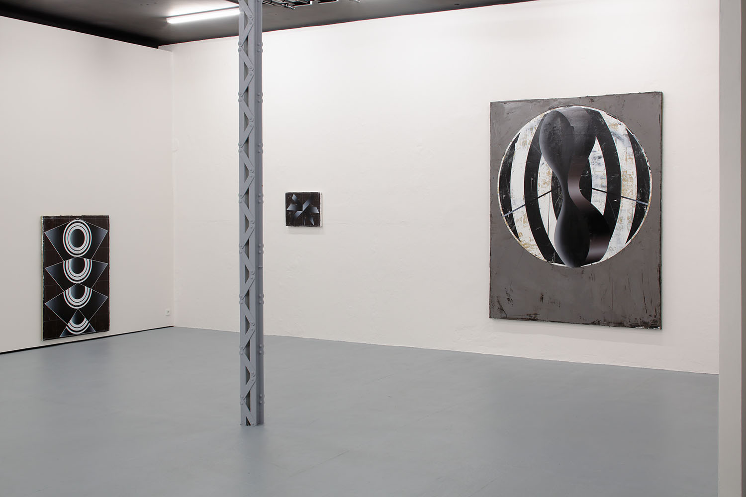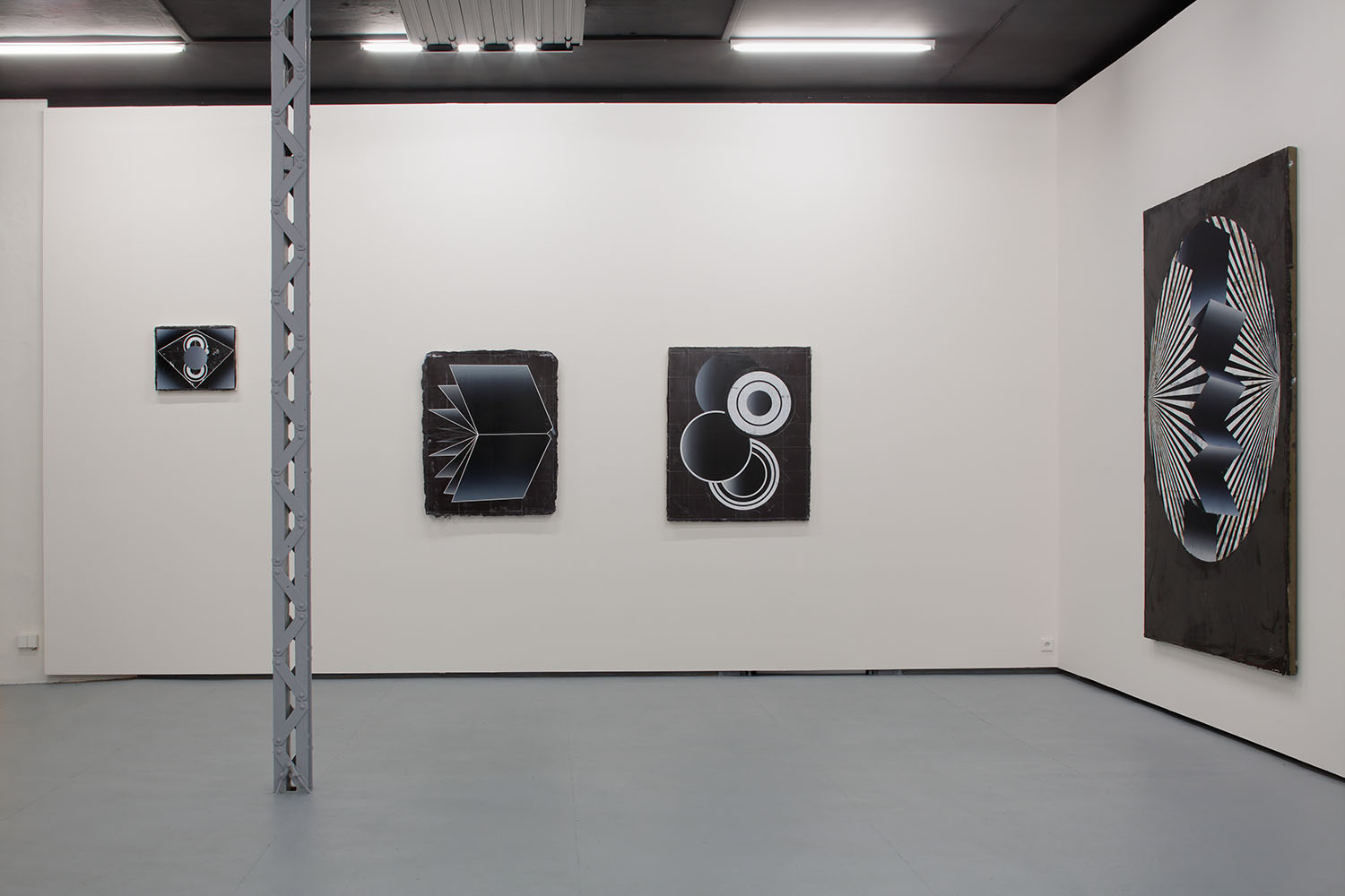 Symmetrical arrangements of concentric circles and polygons dominate the dark paintings in the Future Polis exhibition by Czech artist Vladimir Houdek.