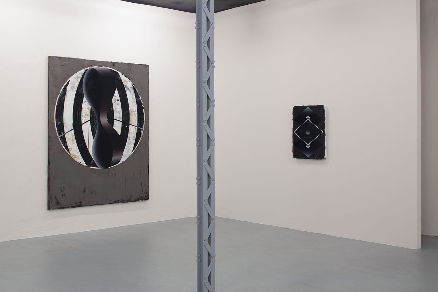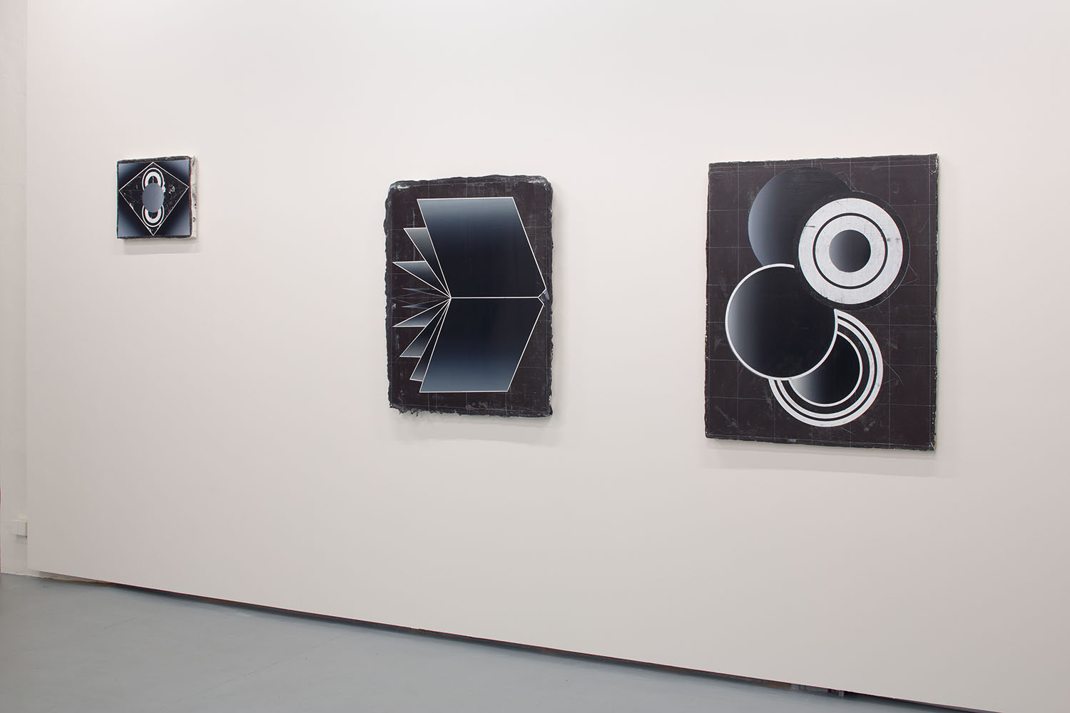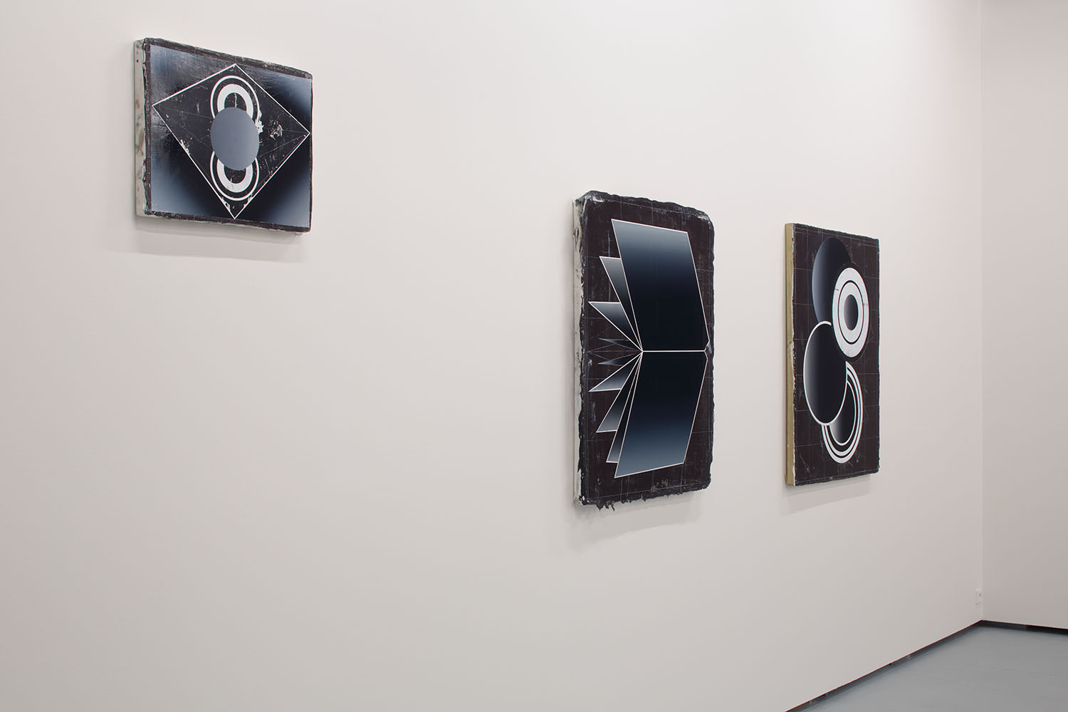 In their sombre and striking, almost poster-like quality, the works in Future Polis are reminiscent of emblems that might derive from futuristic films such as Metropolis (1927) or Solaris (1972). Two major innovations are thematised and developed in these films: industrialisation and space travel. In the future city Metropolis machines run the living environment. In Solaris a planet that enables forces the space travelers to live in materialised memories takes over. In the work series Memory, the re-presentation of the past is depicted in the form of open books and fold-outs. In a large-format painting, that kind of a storage medium of knowledge such as this appears in a circle of radially expanding black-and-white lines. Comparable to a group of works by Francis Picabia from the early 1920’s, (Octophon, Conversation, Volucelle, etc.), classified as “late dada-machinist style,” an optical effect arises through the wavering of the lines that casts the objects into space. In Houdek’s work, subtly nuanced gradations of shading make the floating objects appear three-dimensional. However, apparent light reflections shape and modulate the surfaces and figures in an aesthetic rather than a natural manner. Here, the pictures correspond more to models than to illustrations. Houdek combines their sleekness with surfaces that seem to bear traces of mechanical working and at the same time can be interpreted as stellar nebulae. At this interface the images open up the infinite space of the cosmos in which planets hover, encountering the eye of the beholder like the eyes of an alien power.