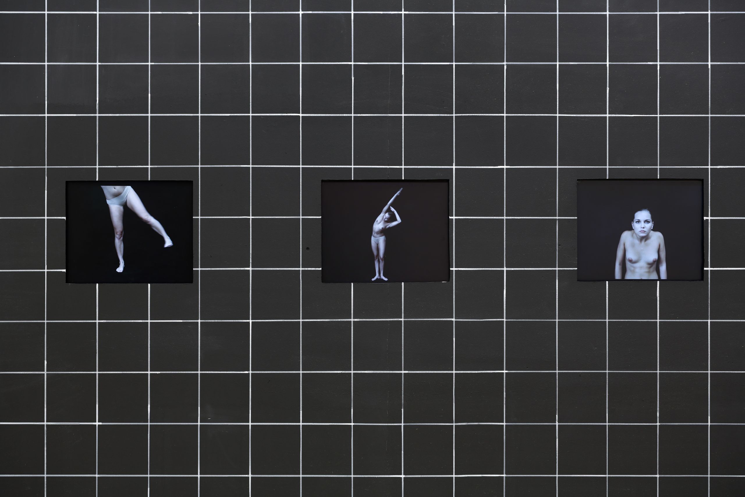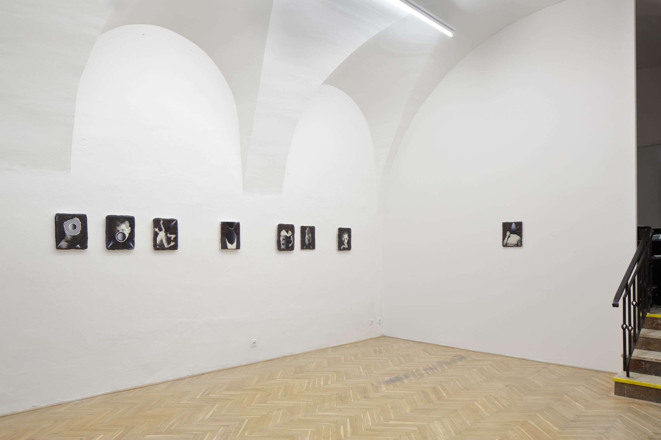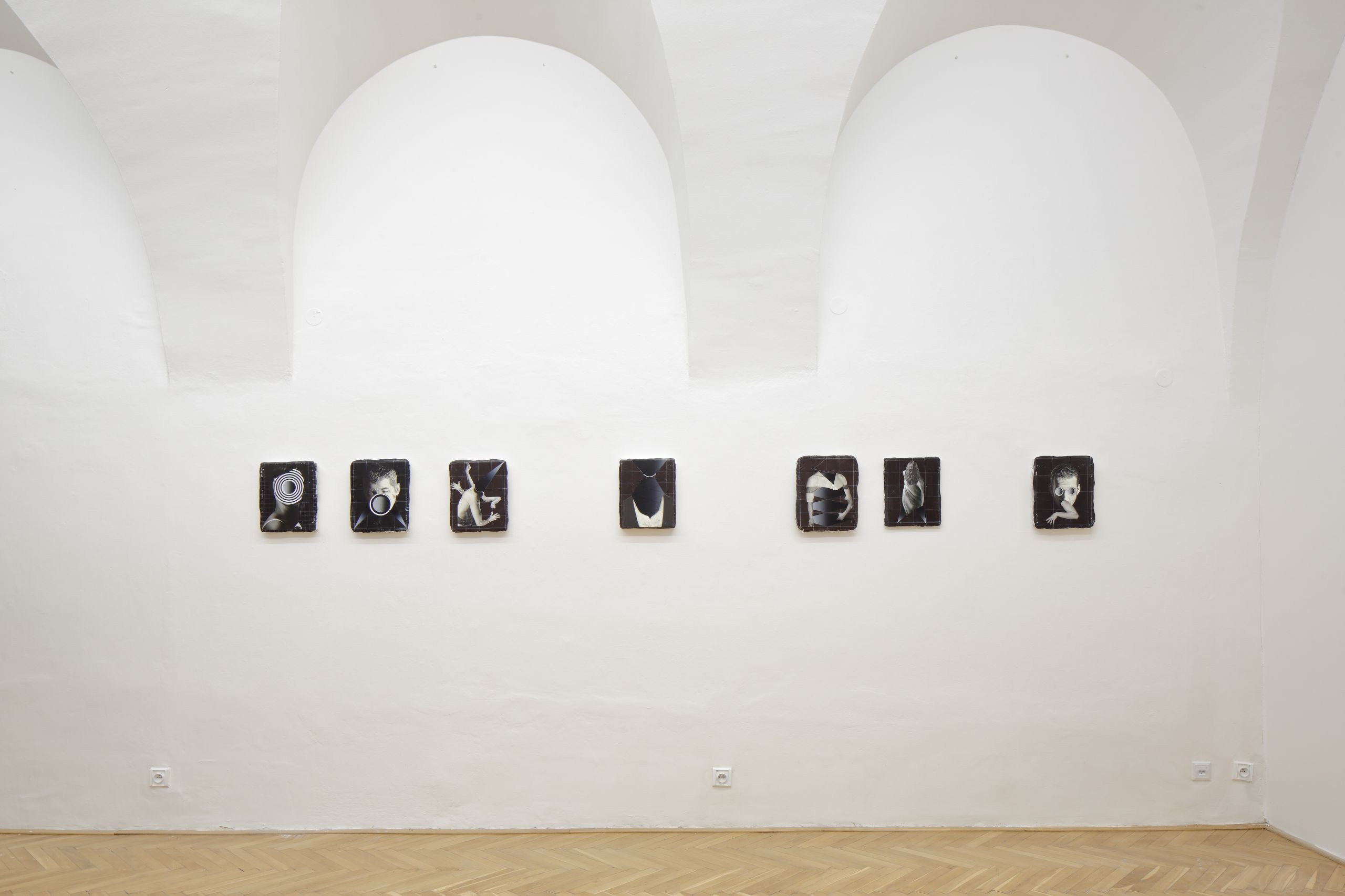 The choreography is rooted in the artist’s collages, which are interpreted and transformed into another expressive language. The exhibition presents a visually striking and expressively refined collage that sits at the intersection of installation, theatre, cabaret, film, and photography. Central to the installation is a network that acts as a grid, framing the entire composition.