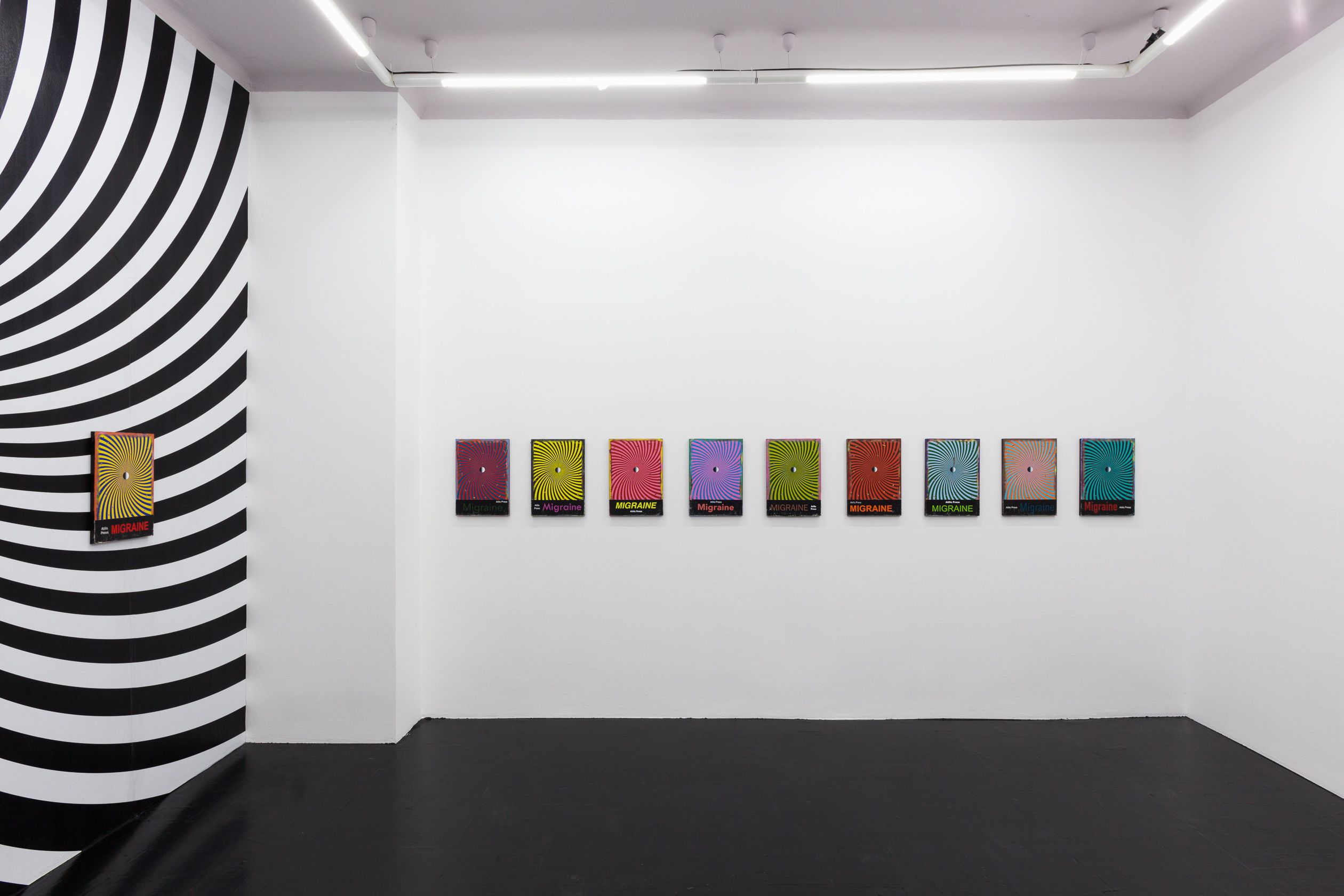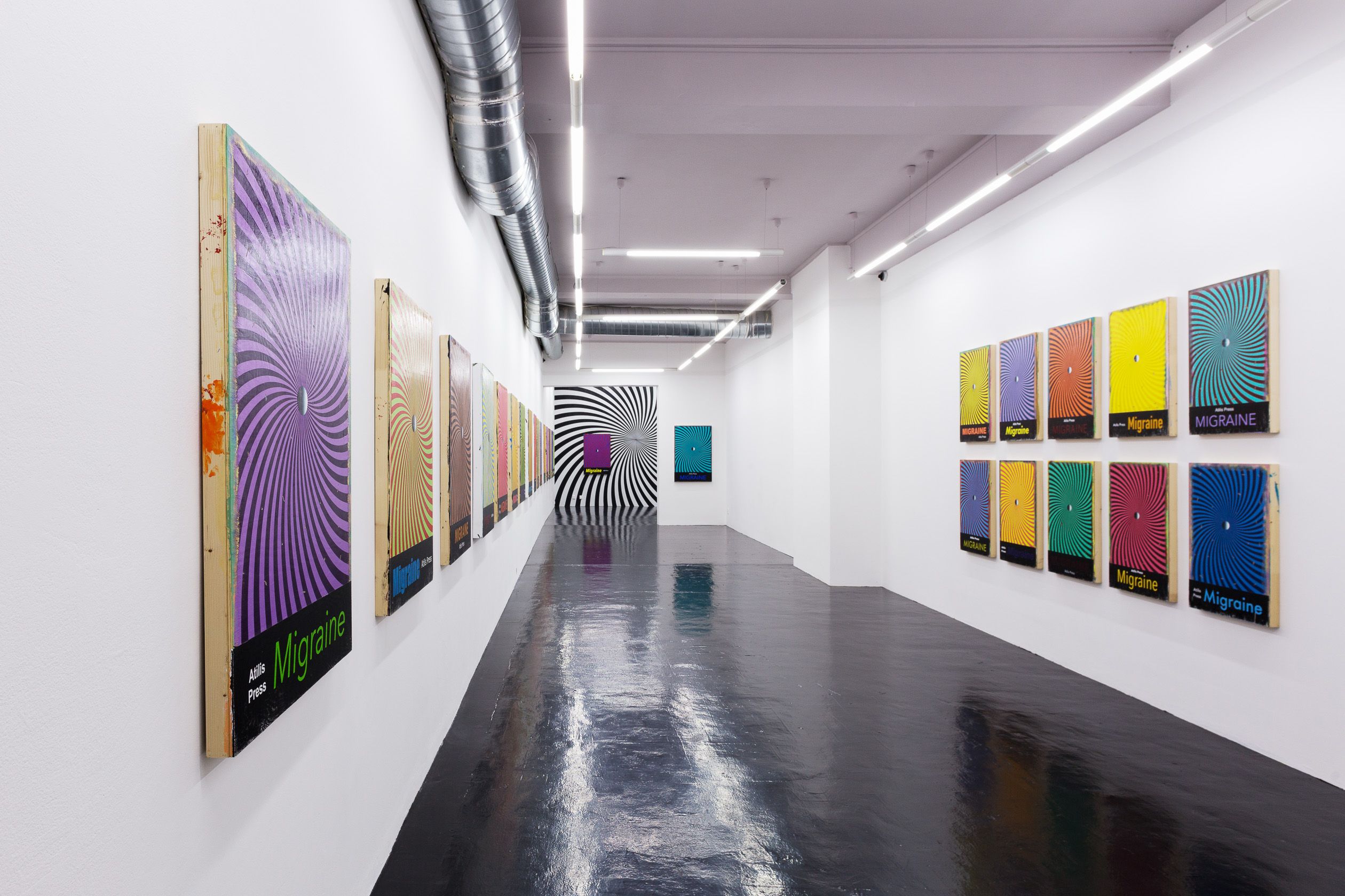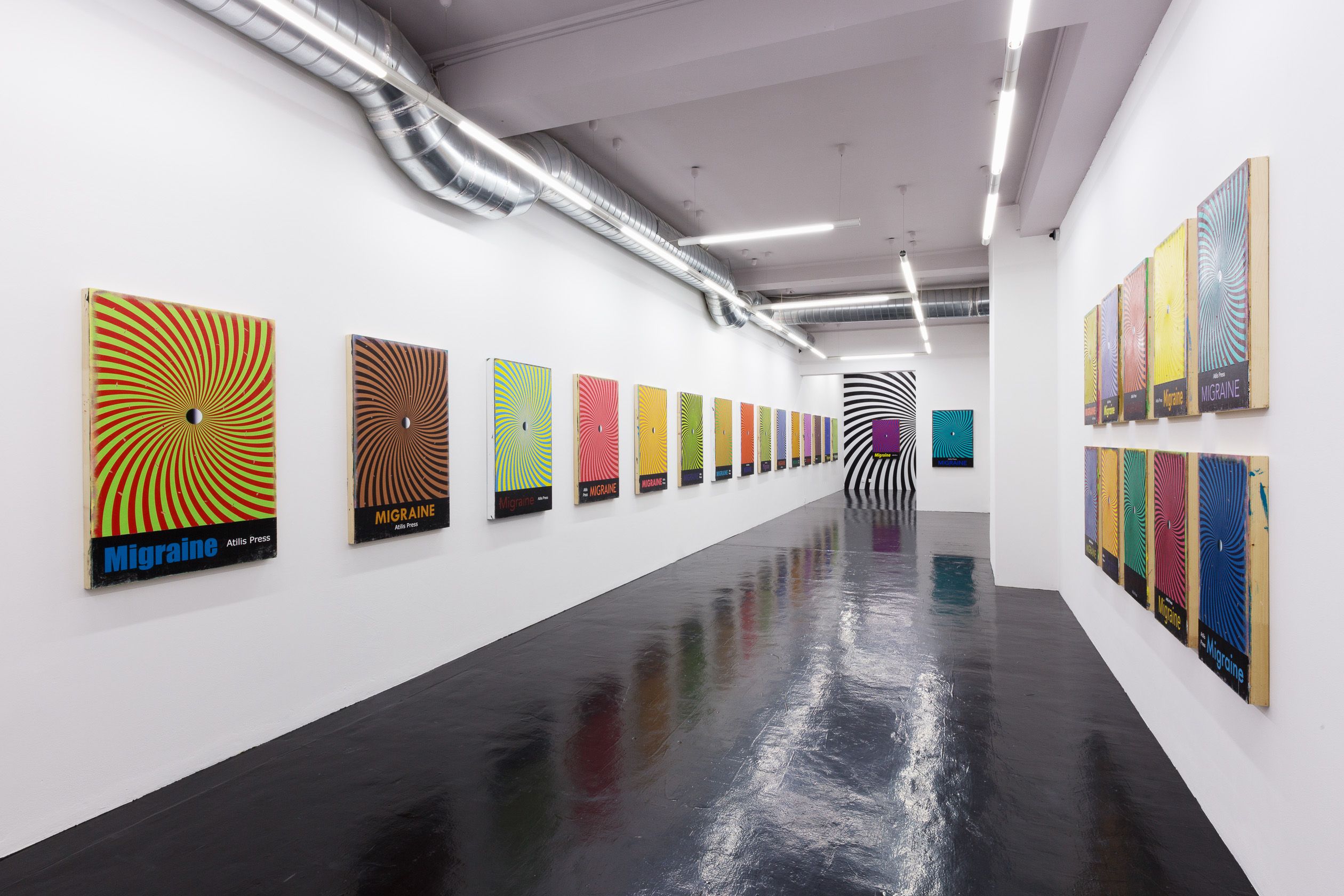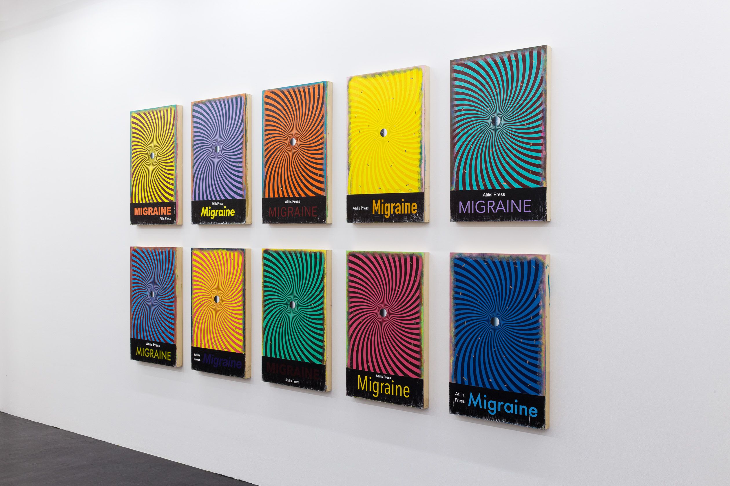 August 31, 2021 12:00 am - September 29, 2021 12:00 am Curator: Pavel Kubesa Photos by: Galerie NoD NoD, Dlouhá 33, Old Town, CzechiaThe Migraine series consists of 38 paintings in three different formats. Each format can be seen as representing a single “year” or a reissue of older editions. What remains essential, however, is the idea of multiplicity, which conveys a sense of constant repetition—the “eternal return of the same.” The central motif, repeated in a regular arrangement within the gallery space, evokes the organized shelves of a library, where edited volumes are stacked in horizontal rows. Through an empathetic lens, Houdek’s Migraine series can be interpreted as an expansive personal “library of pain,” whose existence is evident but remains concealed behind its individual covers for those who have not experienced it.