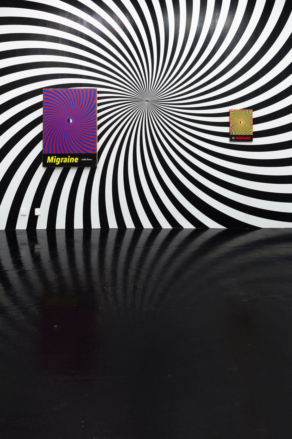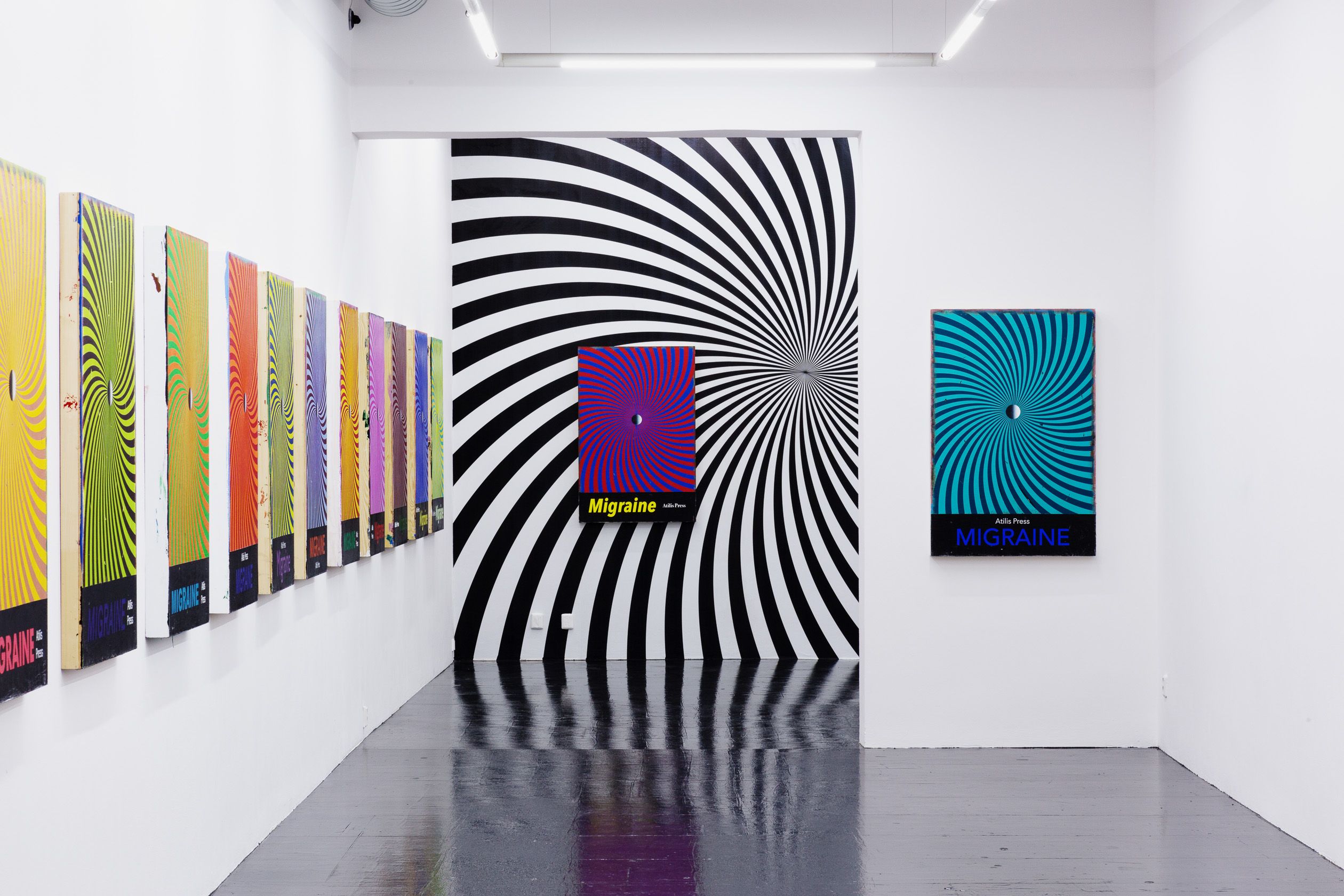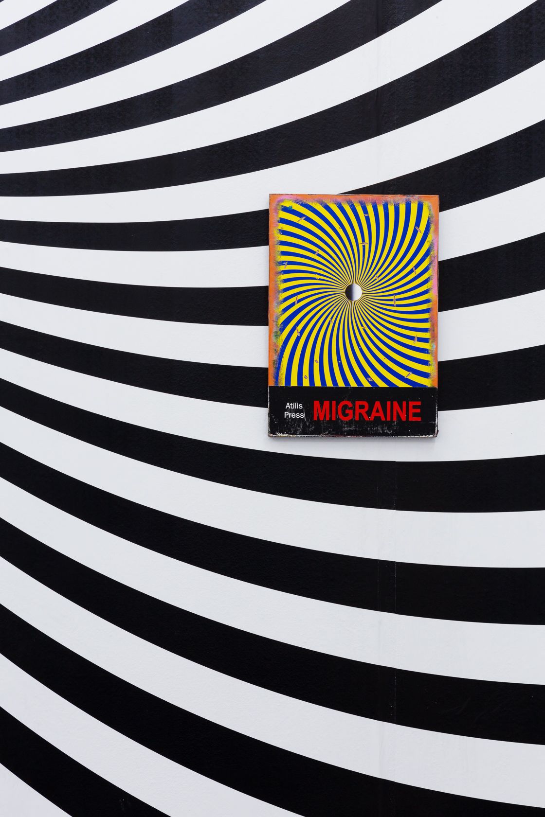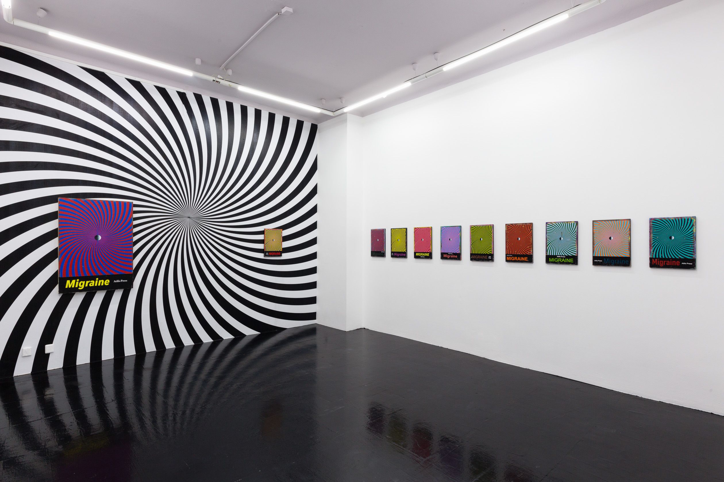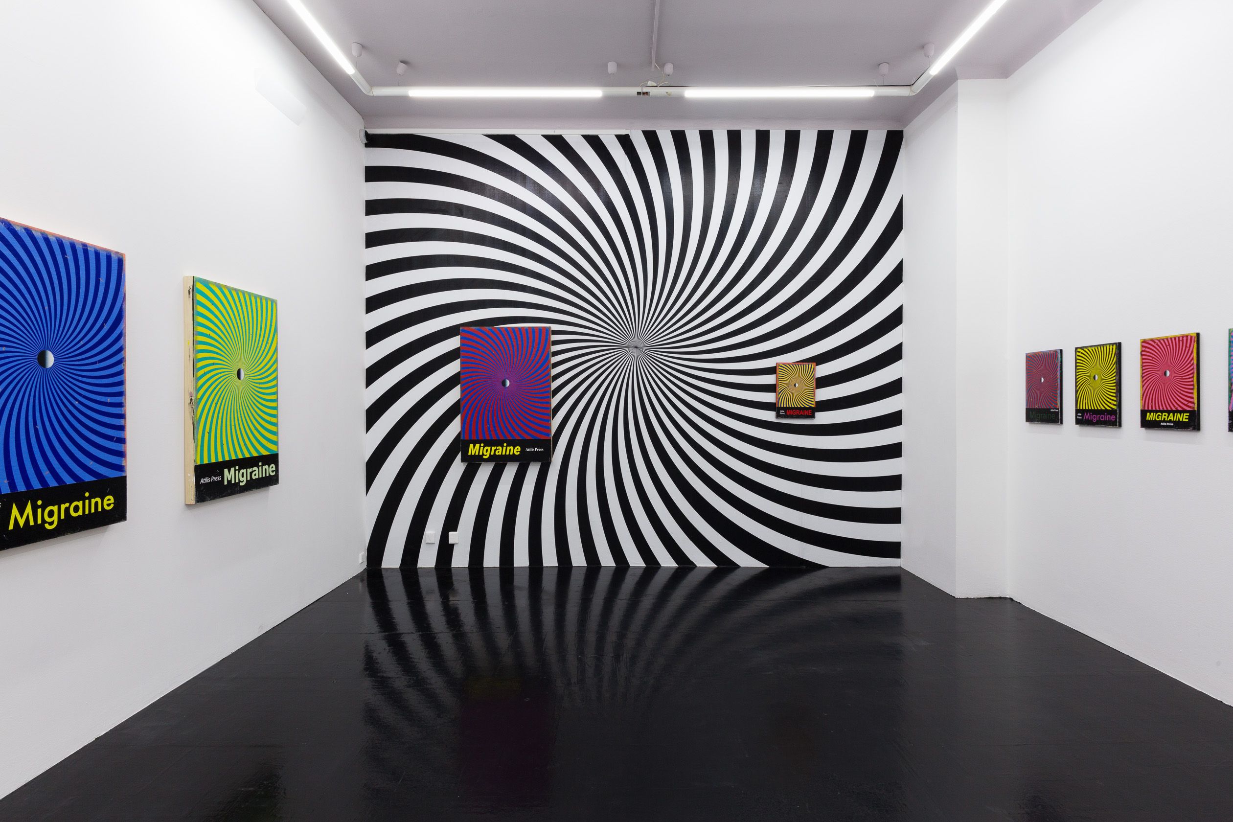 August 31, 2021 12:00 am - September 29, 2021 12:00 am Curator: Pavel Kubesa Photos by: Galerie NoD NoD, Dlouhá 33, Old Town, CzechiaThe Migraine series consists of 38 paintings in three different formats. Each format can be seen as representing a single “year” or a reissue of older editions. What remains essential, however, is the idea of multiplicity, which conveys a sense of constant repetition—the “eternal return of the same.” The central motif, repeated in a regular arrangement within the gallery space, evokes the organized shelves of a library, where edited volumes are stacked in horizontal rows. Through an empathetic lens, Houdek’s Migraine series can be interpreted as an expansive personal “library of pain,” whose existence is evident but remains concealed behind its individual covers for those who have not experienced it.