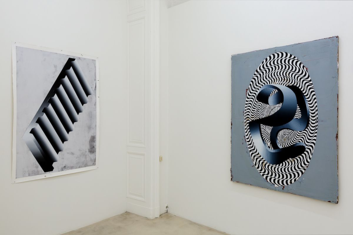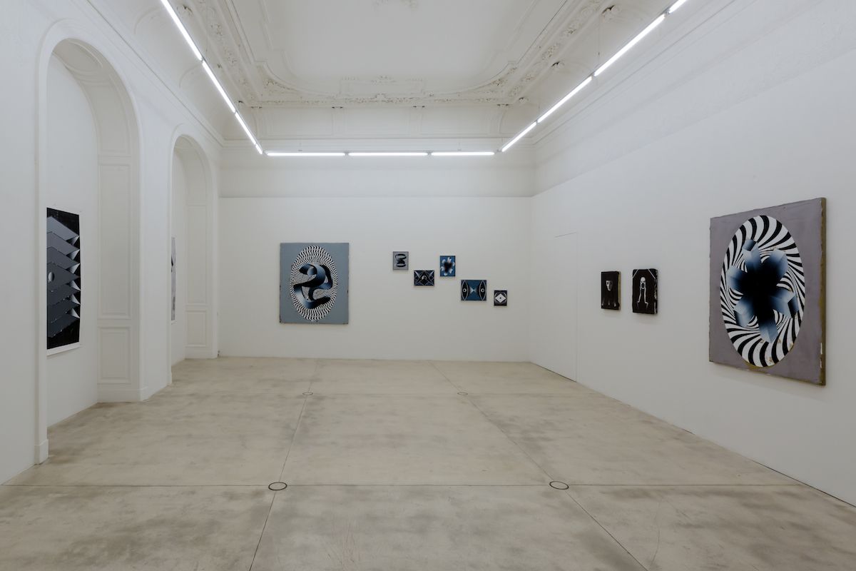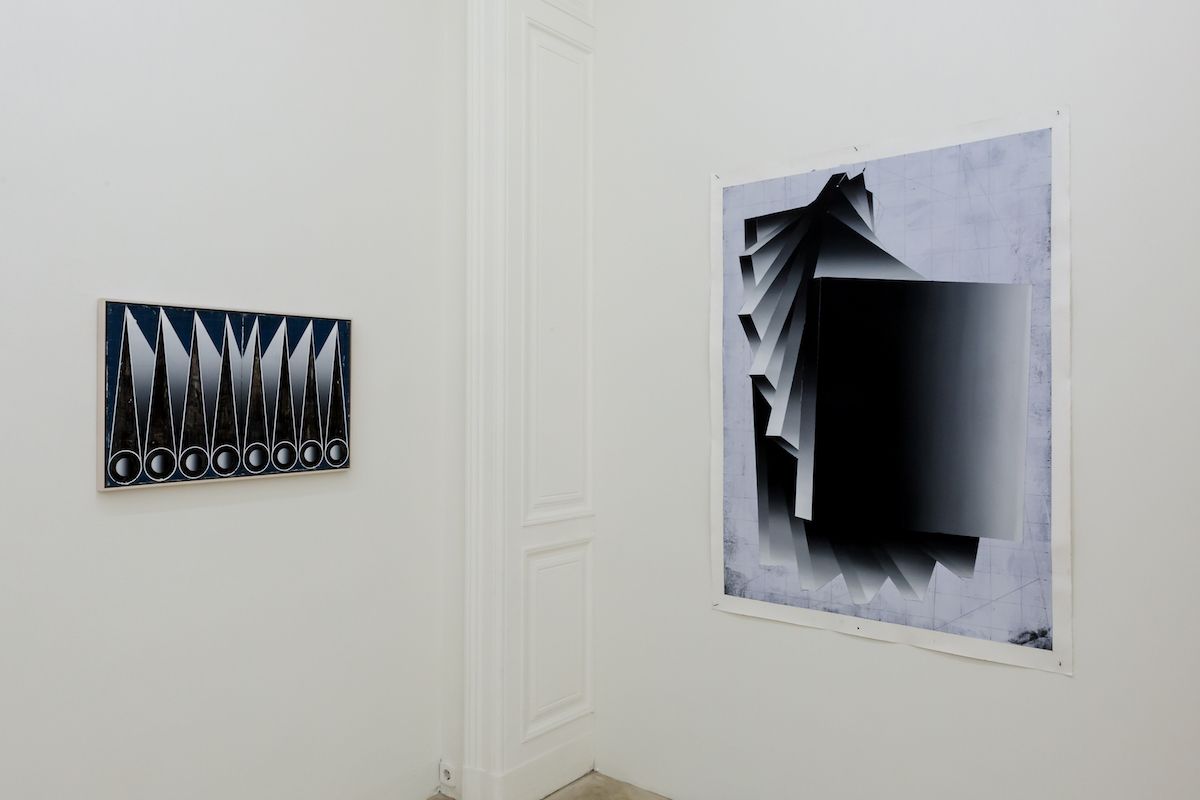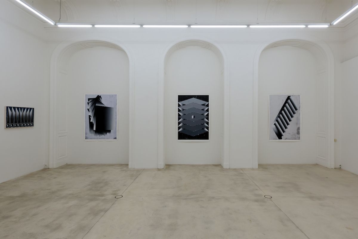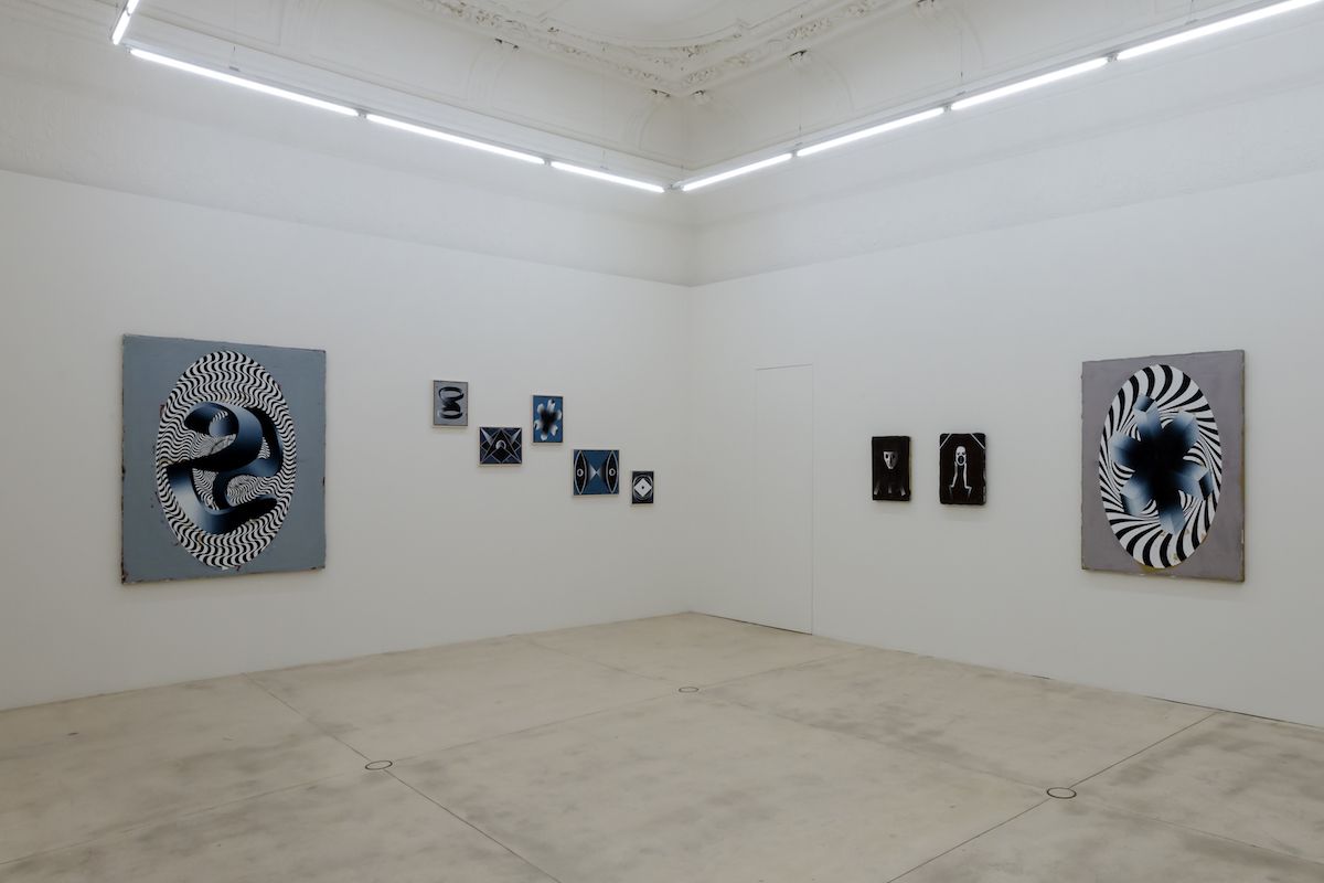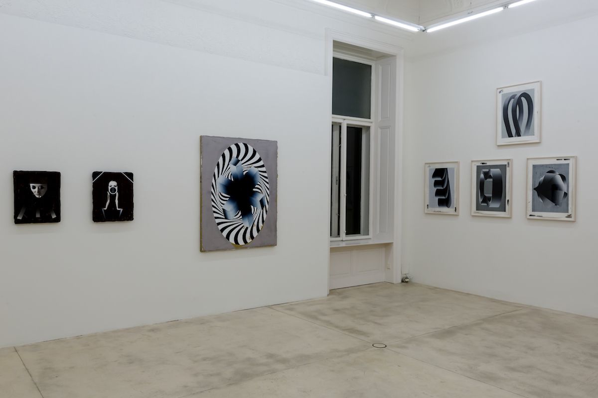 At first glance, Houdek’s paintings resemble geometric ornaments. One sees circles, rectangles, ellipses, diamonds and folds that come together in ever-new surprising combinations. At the beginning of his work around 2012 the artist referred to certain prototypes that one encounters in the classics of modern art like Malevich, Kupka or Mondrian. Increasingly, ‘real-life’ objects such as loops, opened accordion books, shelves and similar forms appeared which lend the flat pictures a spatial, three-dimensional effect. These objects then no longer appear as abstract figures but rather as ‘surreal’ objects floating in the space. The many air wheels and rotating discs also figure in a similar way in Houdek’s paintings. They recall shells, rotors of turbines or strange airplanes. Others by contrast are reminiscent of open books or registers.