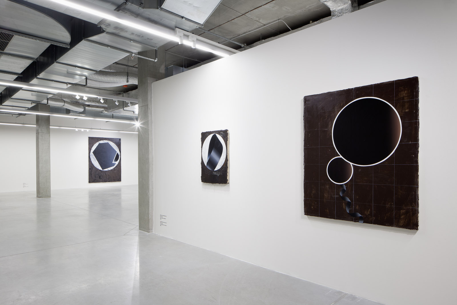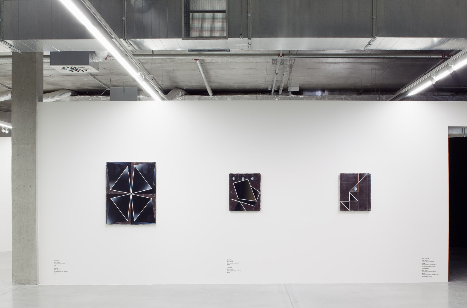 Glowing Alabaster (2012), The Black Open Wide (2012), Dauhas (2011–2012) and now (2014) The Trickling Expanse. Going back four years, it will be a little simpler: Melancholy. Simpler? The names of the cycles, just as with the individual paintings by Vladimír Houdek, are driven by an almost indiscernible discord, contradiction, dislocation and duplication, which open up and form a space. Visible and imagined at the same time. A space filled with how it establishes itself by an almost spontaneous breaking up of the unity that we have always craved for and which is – we think – at the very beginning. Naturally, this unity in the strong sense of the word does not exist. Let us call it, for example, an illusion or something similar to parallel lines meeting in infinity: we can prove it mathematically; we can maybe even imagine it, but we always start (and end up) with an image of at least two independent straight lines separated by another line.